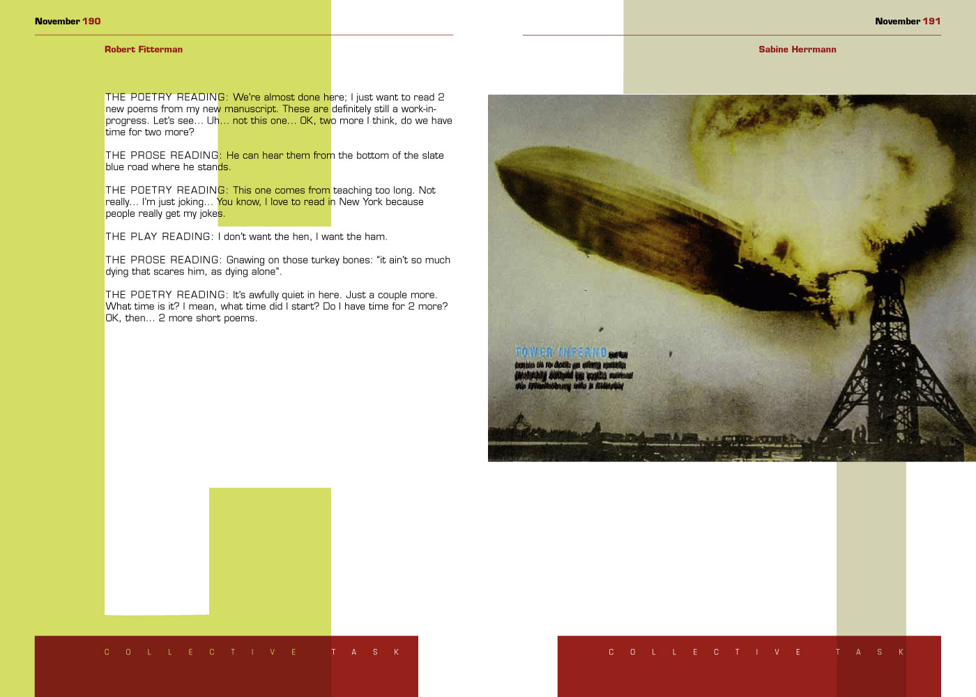 Conceived by Rob Fitterman, designed by Dirk Rowntree in 2010. Featuring: Tim Davis, Monica de la Torre, Stacy Doris, Rob Fitterman, Sabine Herrmann, Klaus Killisch, Carol Mirakove, Yedda Morrison, Kim Rosenfield, Lisa Sanditz, Rod Smith, Juliana Spahr. It represents our first printed collection and contains responses from cycle 1 with 230 pages. Browse here through online book.