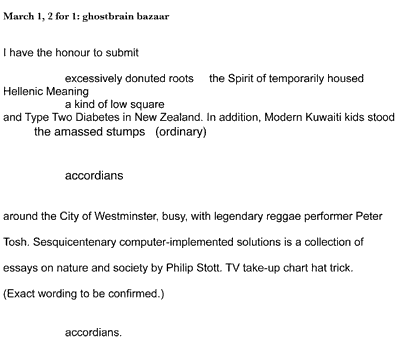 Collective tasks start on March 1, 2006, each member of this project will propose a task on the first of each month for the group to complete. Each group member will interpret or execute the task in any way and thru any medium (text, sound files, images, etc.). One of the few ground rules will be that the end of each month is a strict deadline. At the end of each month, each member will send me his or her piece. At the end of the year, we'll publish and/or present publicly our 10 collective tasks.
